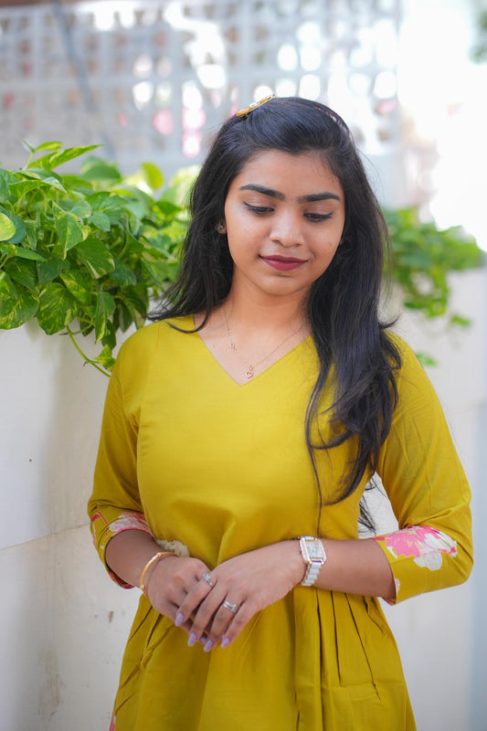 Mustard Magic A-Line Cotton Dress – Hakoba Patch Pleated Maxi