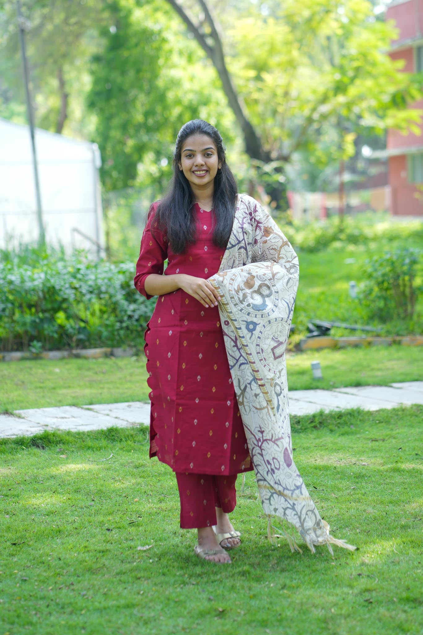 Crimson Red Raw Silk Co-Ord Set with Scalloped Hemline