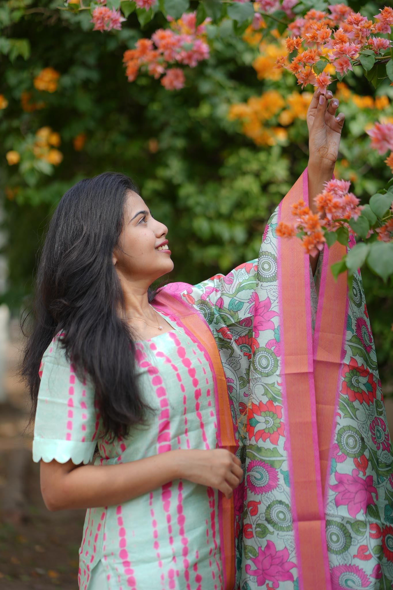Experience effortless elegance with this Light Green & Pink Floral Tussar 3-Piece Suit Set, thoughtfully designed to combine breathable comfort with timeless ethnic charm. Crafted from a premium Tussar blend, this ensemble is perfect for women who appreciate refined details and versatile styling.