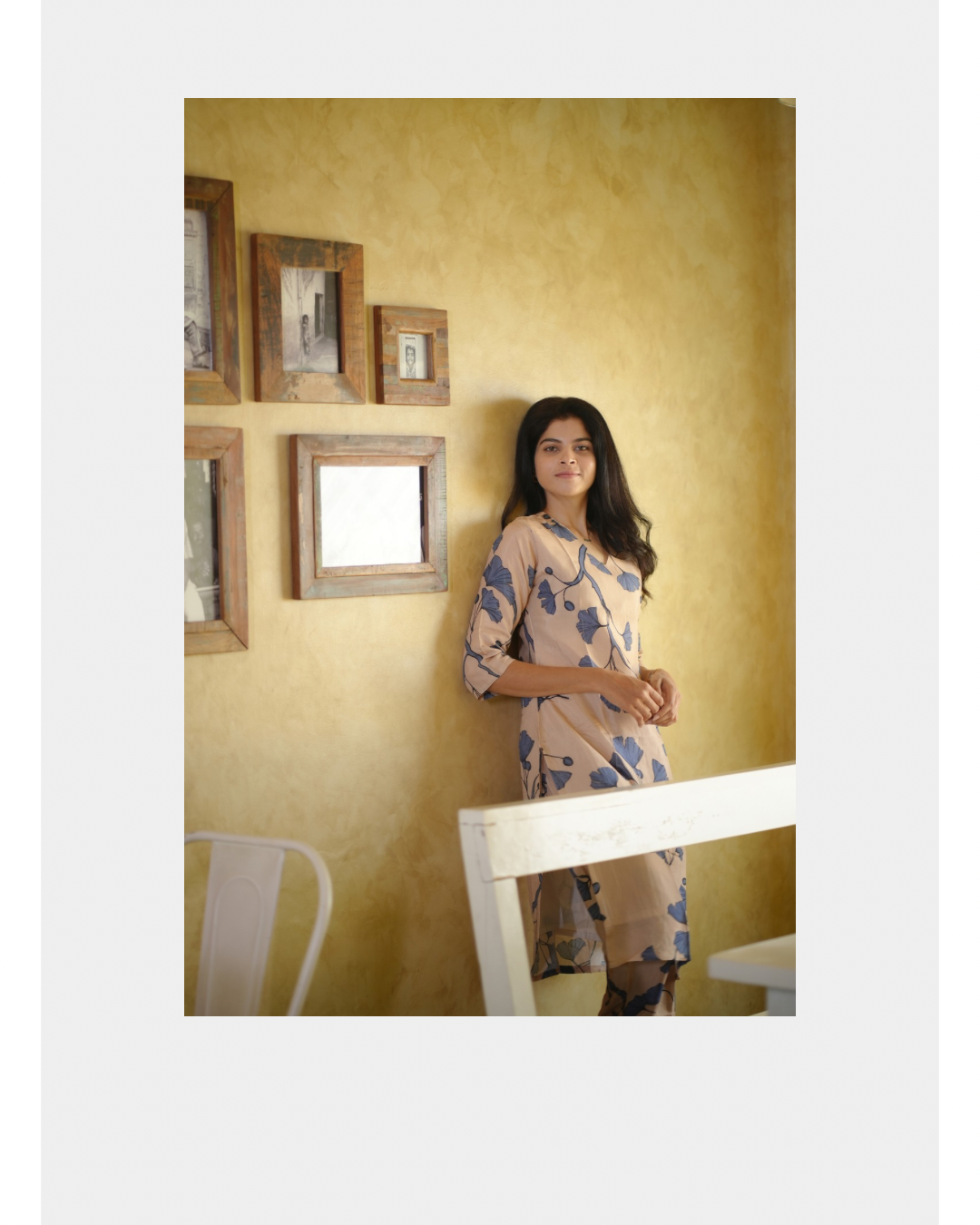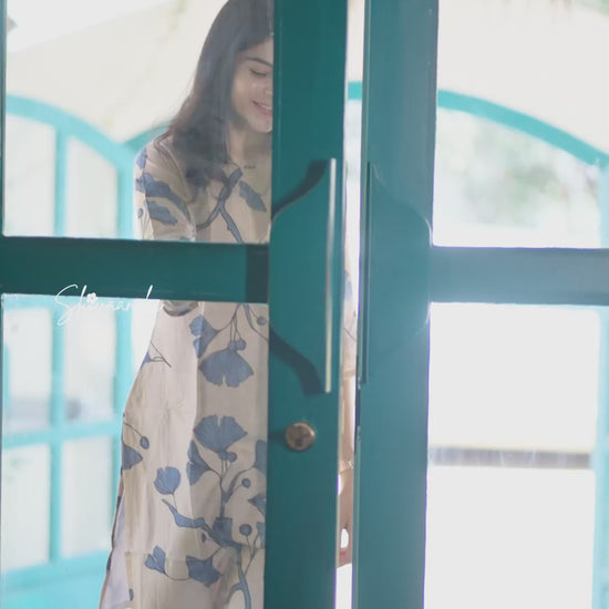Muslin silk fabric with beautiful prints are perfect for casual as well as ethnic looks. This floral design in blue in the beige base color is something new and must try out for any skin. It comes with lining and a simple curved v neck and 3/4 sleeves.