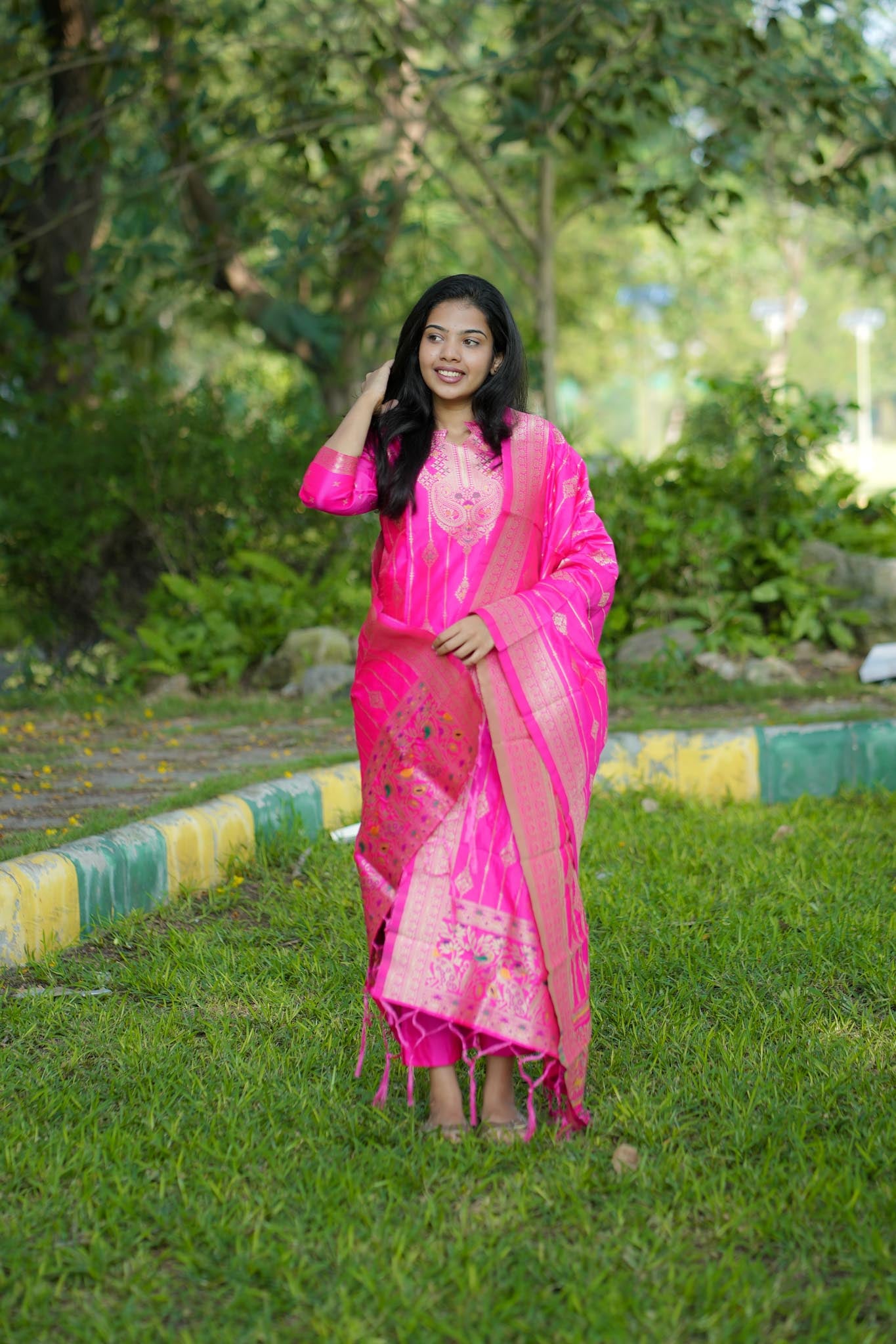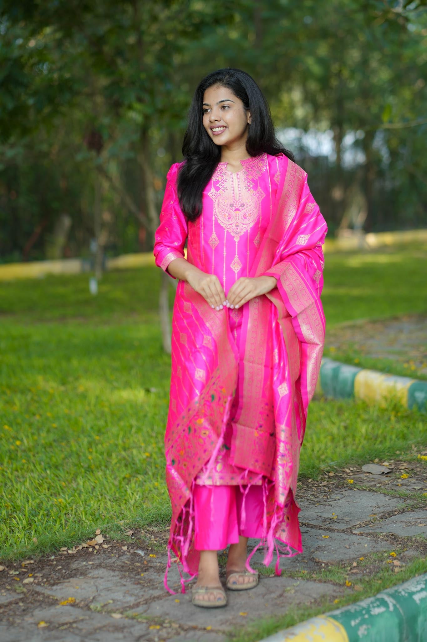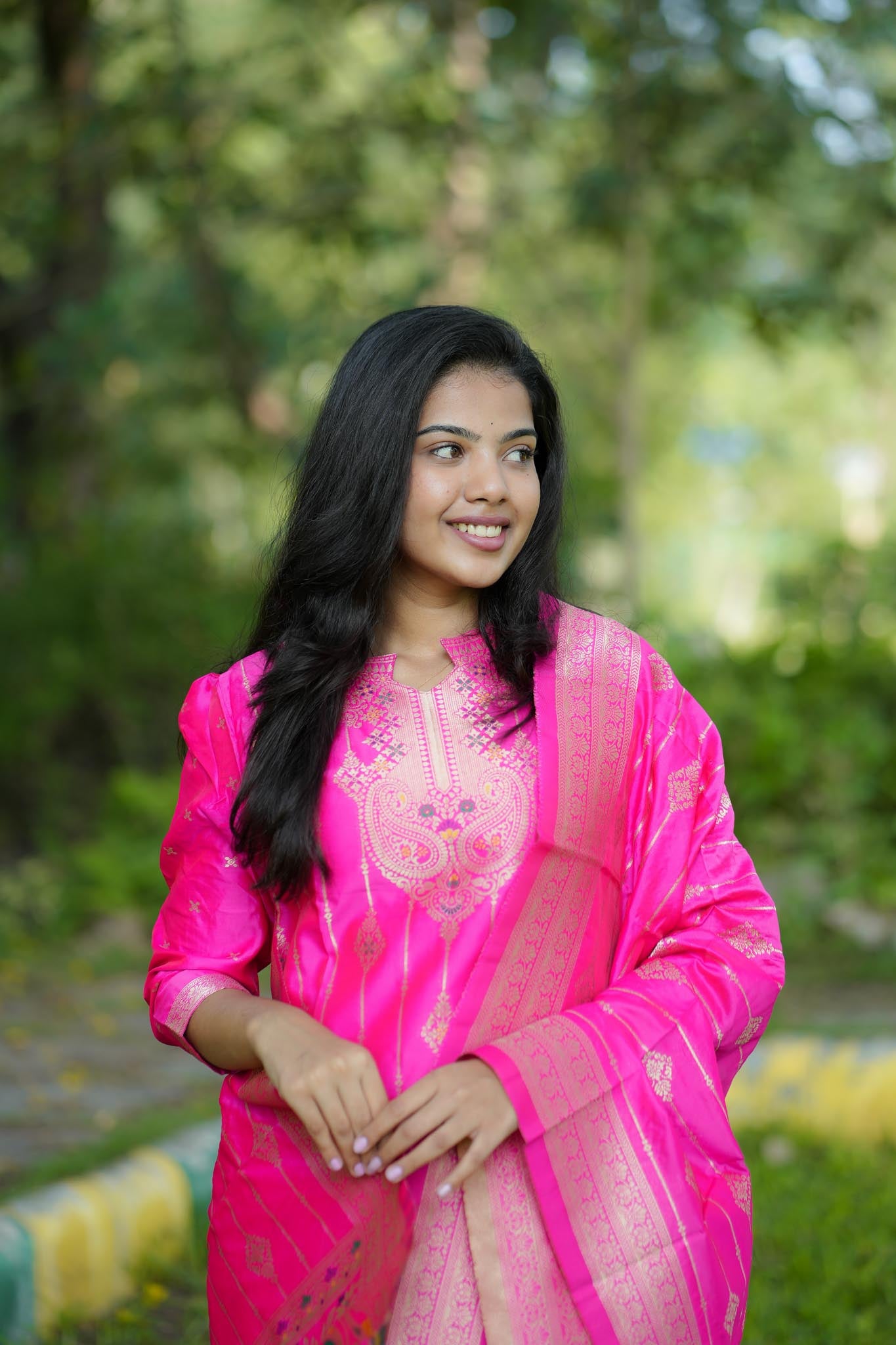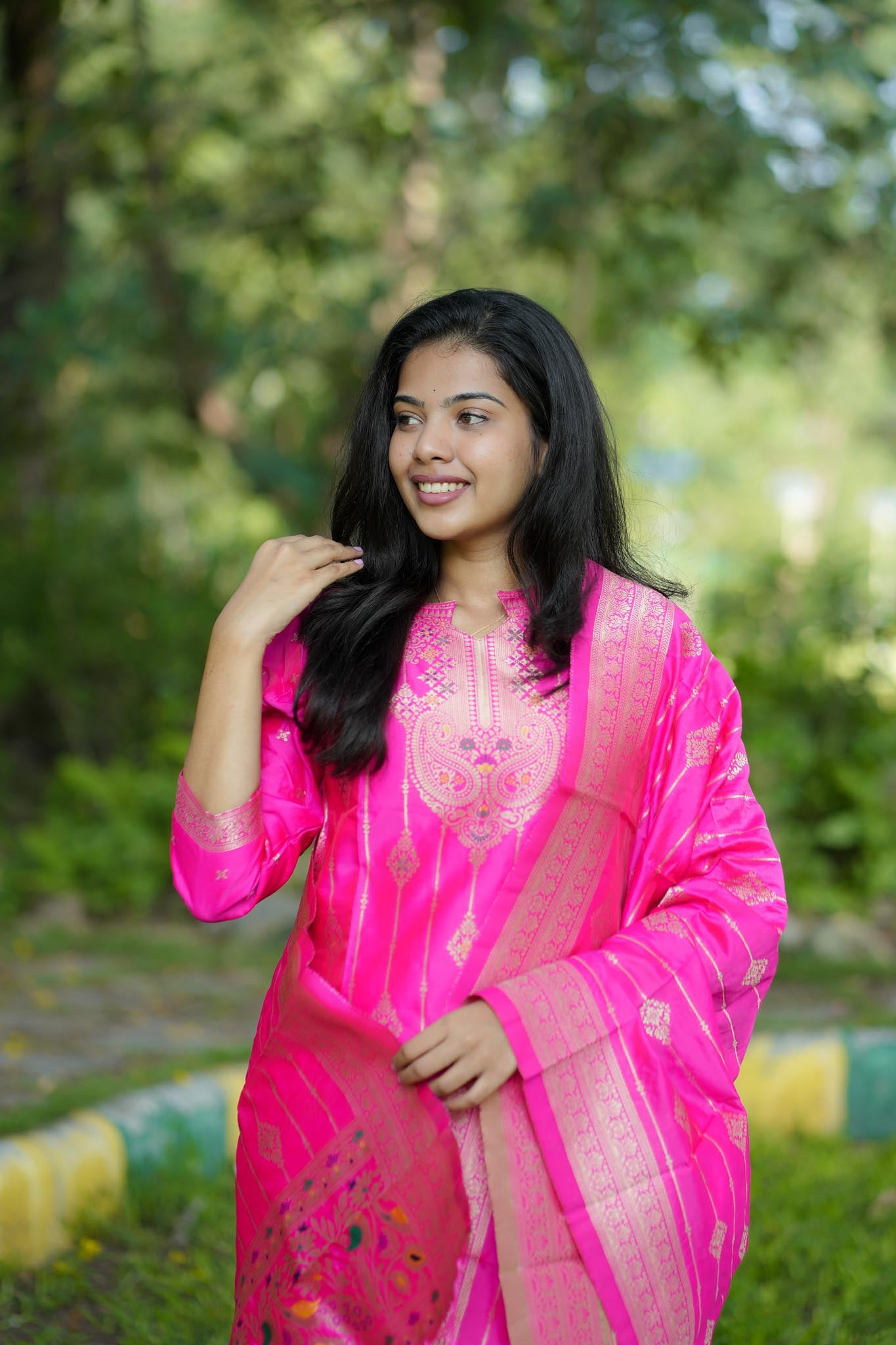 Step into timeless elegance with our Rani Pink Banarasi Silk Suit Set, a luxurious ensemble crafted to make every occasion memorable. Woven in rich Banarasi silk and adorned with intricate gold zari work, this traditional suit set reflects the beauty of heritage craftsmanship with a modern, graceful appeal.