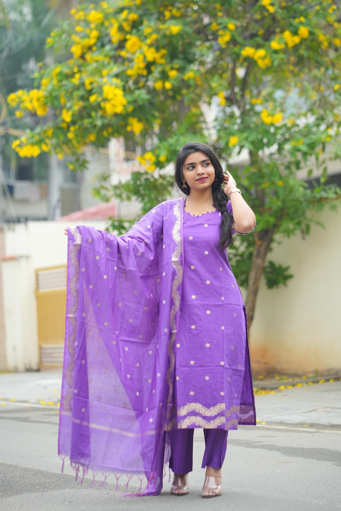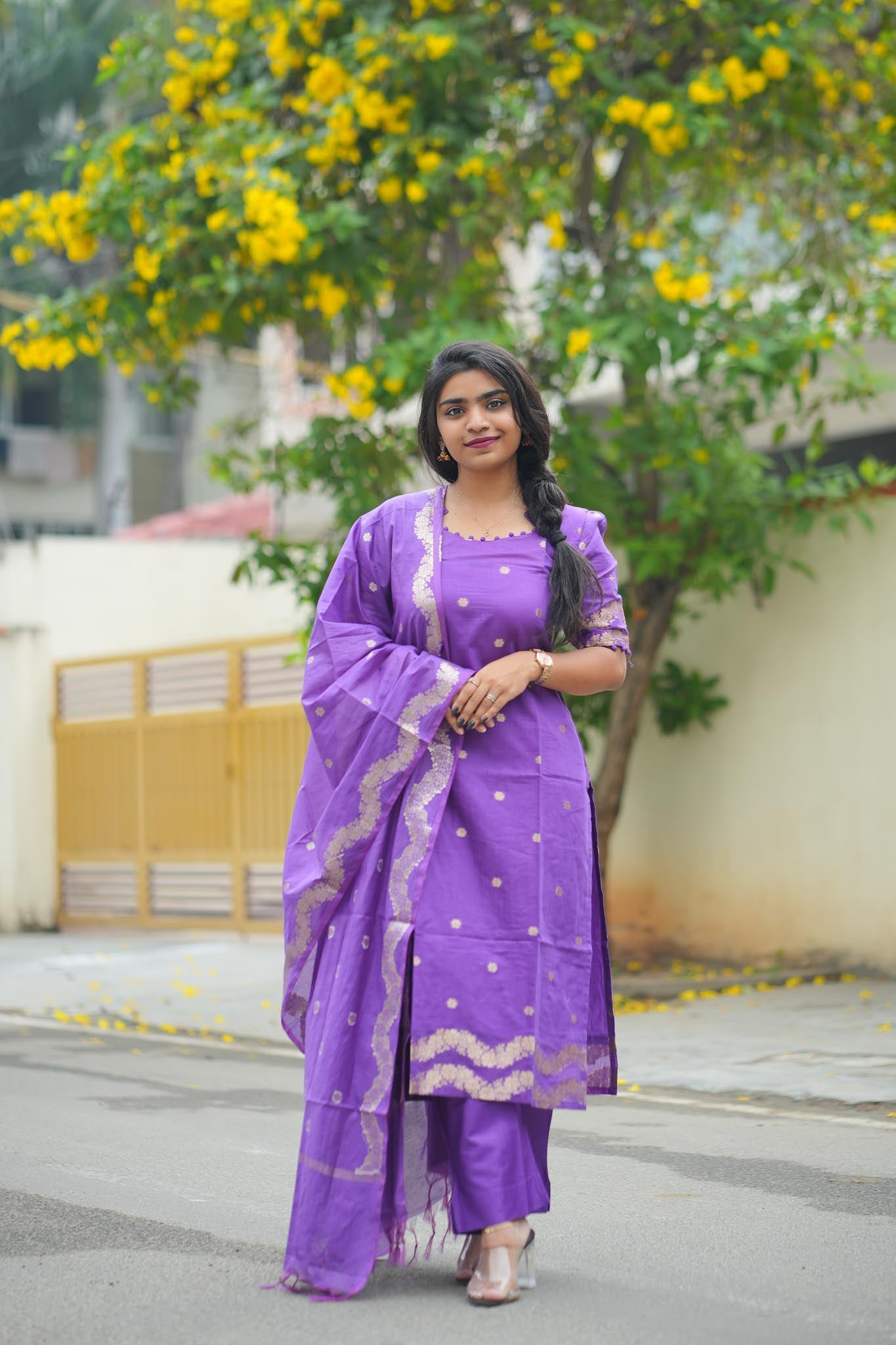 Elevate your ethnic wardrobe with the Sweet Violet Set—where delicate zari work meets understated luxury.