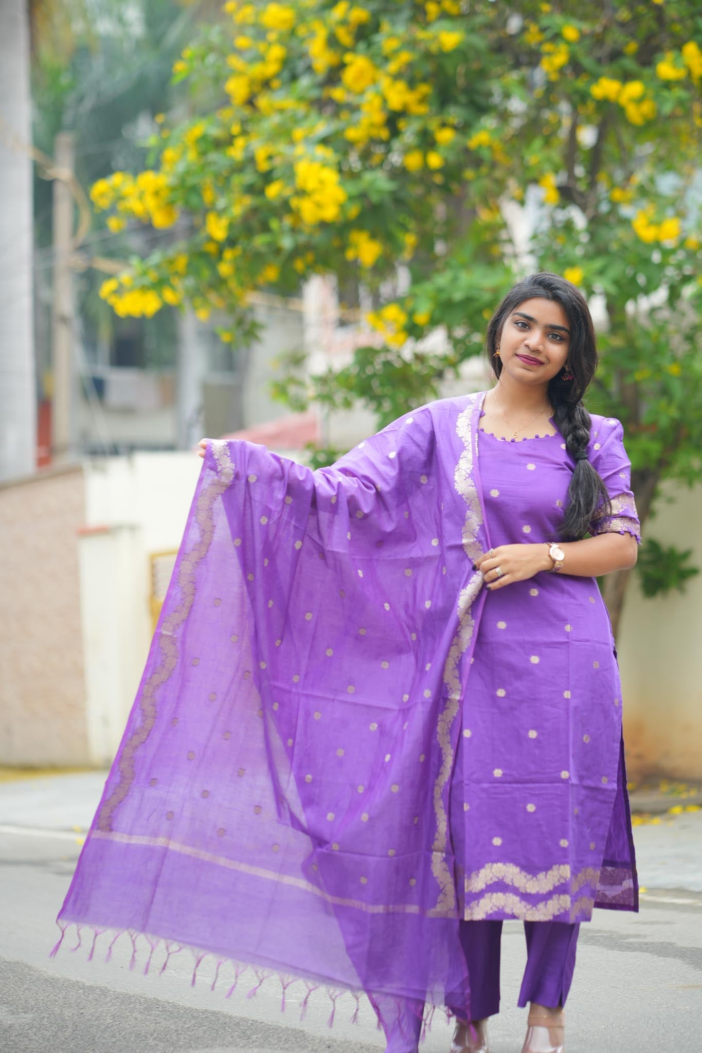 Step into graceful elegance with our Sweet Violet Kurti Pant Dupatta Set, a beautifully crafted monotone ensemble designed to make a subtle yet striking statement. Made from soft silk cotton fabric, this 3-piece set features gold zari floral weaving all over the kurti, adding a rich and refined ethnic touch.