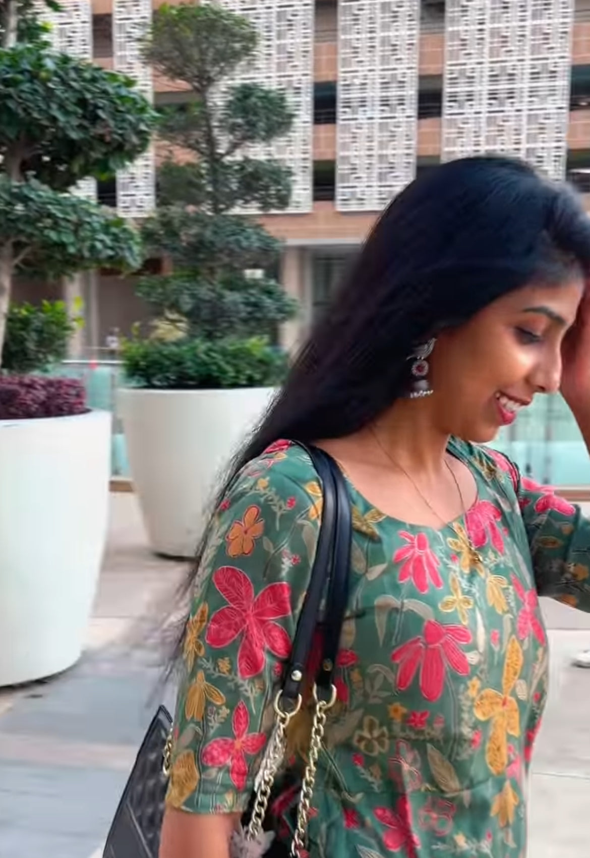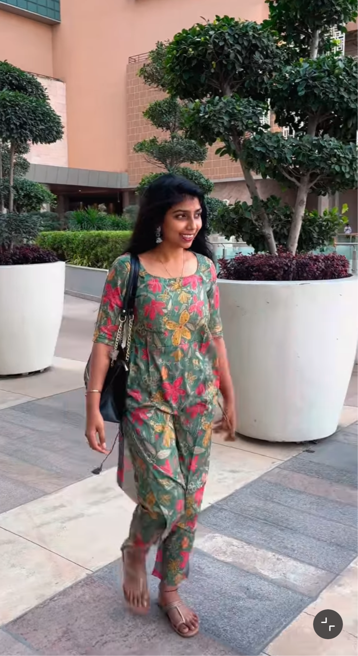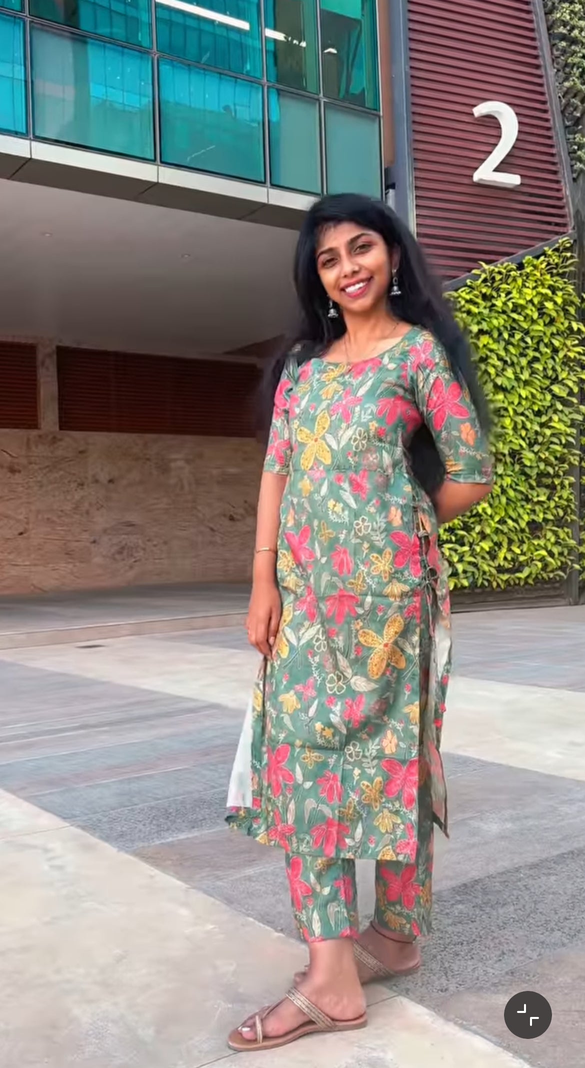 Blue green floral charm coord set is a casual outfit that is light weight and comes with yoke part lining. It has long side slits with Dori detailing for a chic and casual look. It has a straight elastic pants.